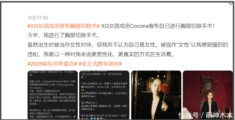 ——最近由7位日籍成员组成的女团XG意外受到关注,原因在于XG团内年龄最小的成员COCONA(秋山心响)自曝接受了胸部切除手术,她表示自己是AFAB的Transmasculine Non-binary,在家人、成员、公司的支持下去除了自己的女性特征。